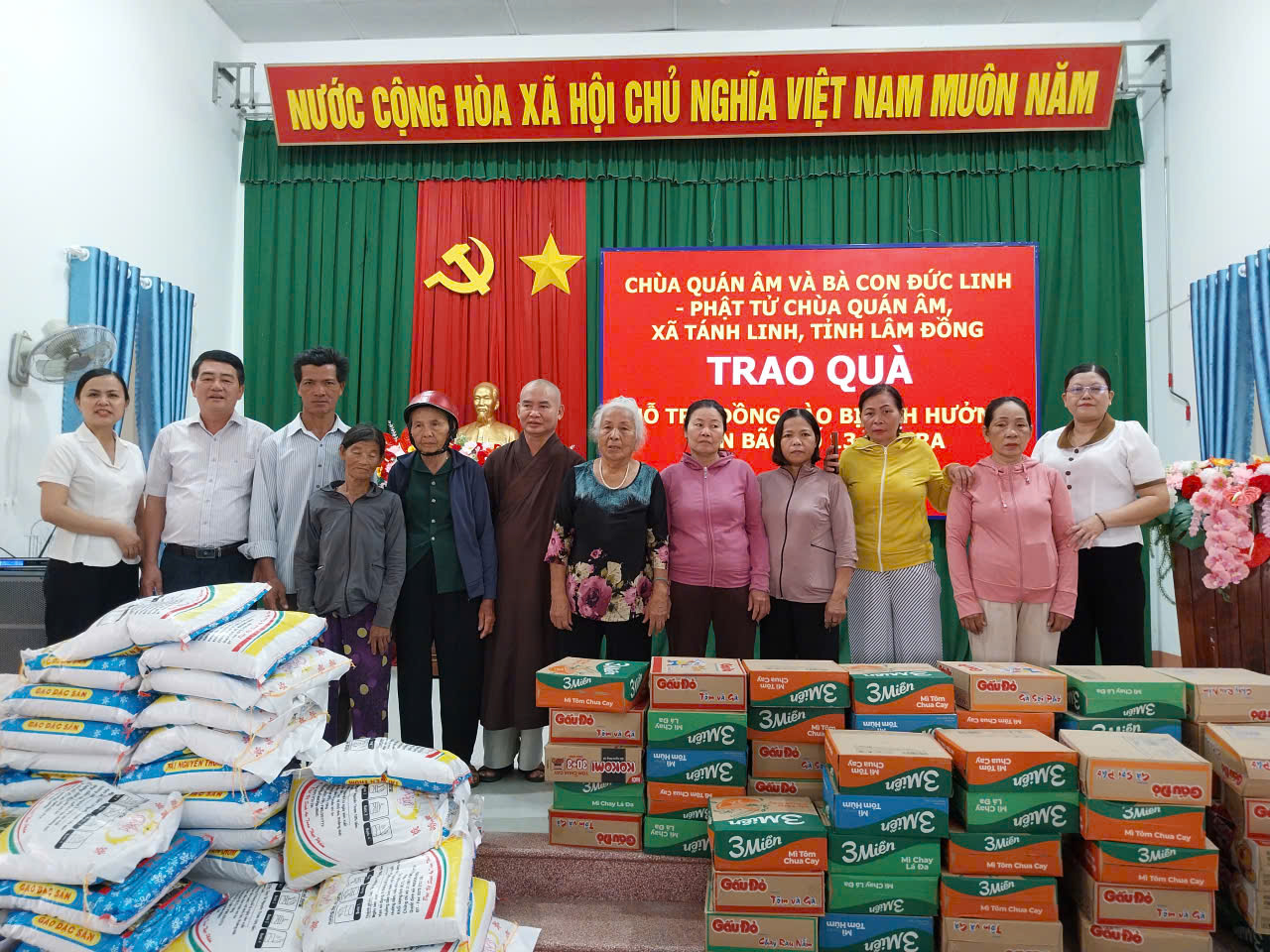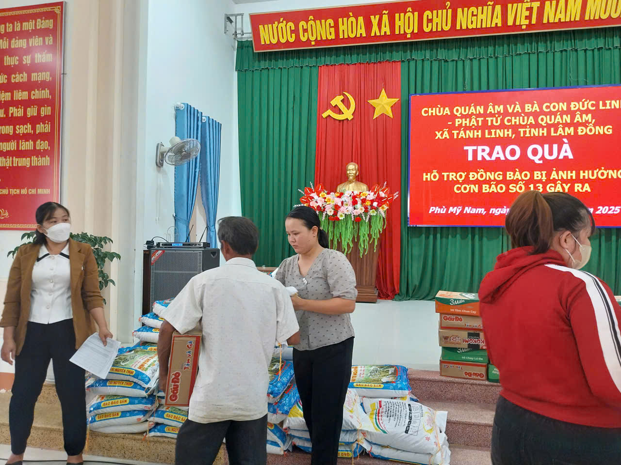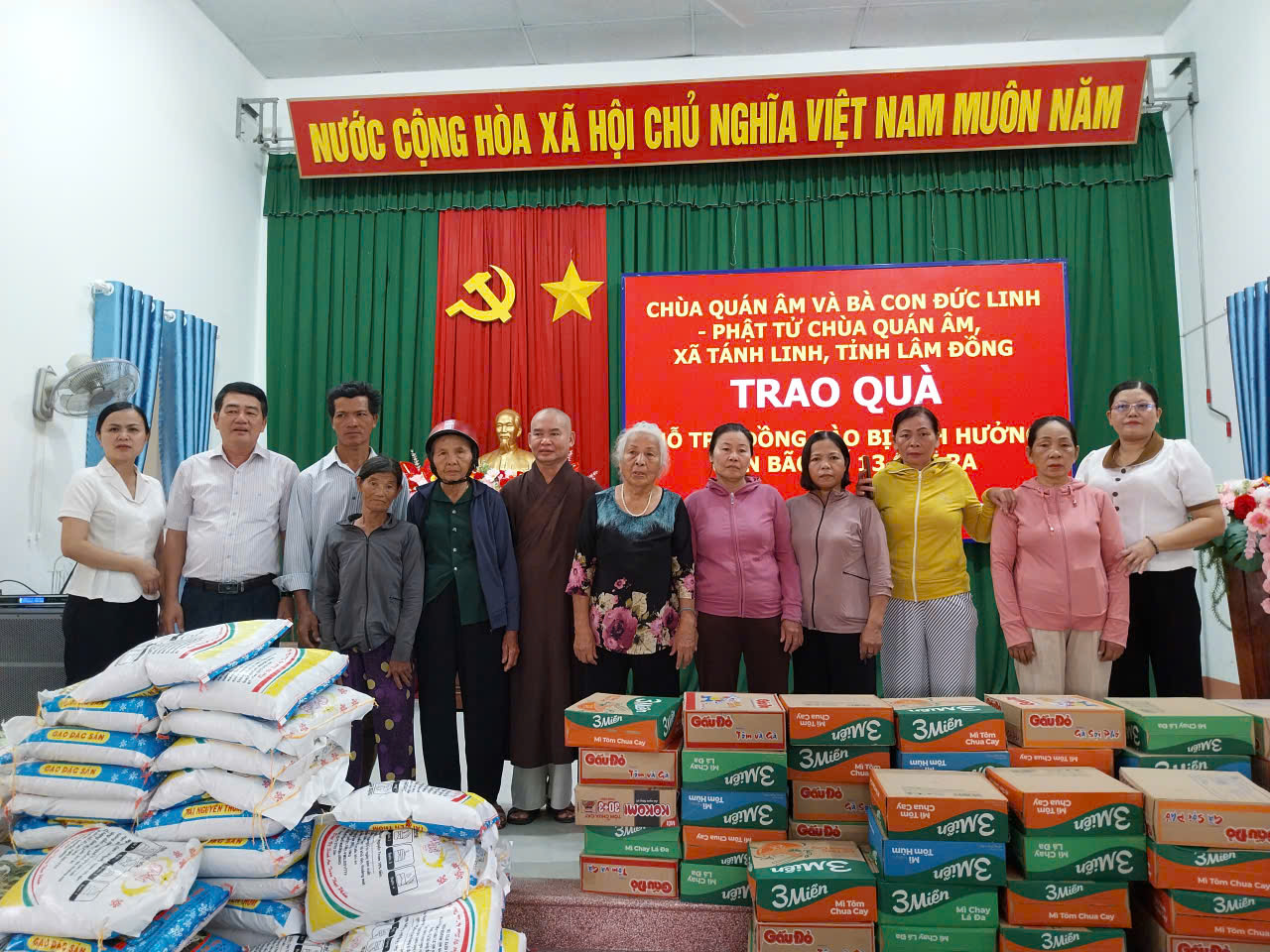 Theo đó, bà con Đức Linh - phật tử chùa Quán Âm, tỉnh Lâm Đồng đã đến thăm và trao tổng cộng 120 phần quà, tổng kinh phí khoảng 36 triệu đồng cho các hộ dân bị ảnh hưởng bởi cơn bão số 13 gây ra. Các phần quà gồm mì tôm, gạo được trao tận tay người dân, nhằm giúp người dân vượt qua khó khăn, sớm ổn định cuộc sống sau bão.