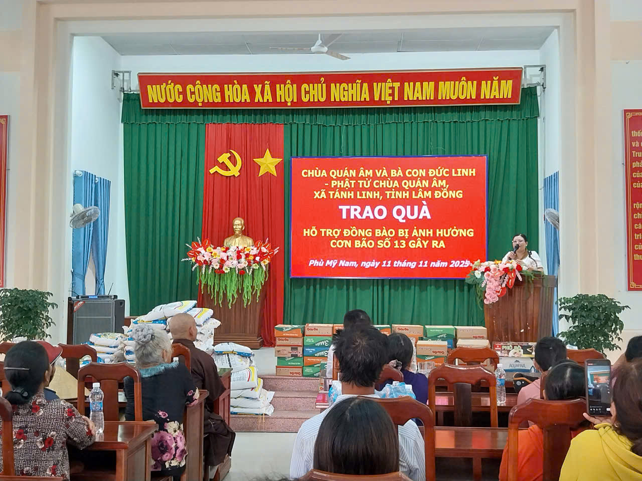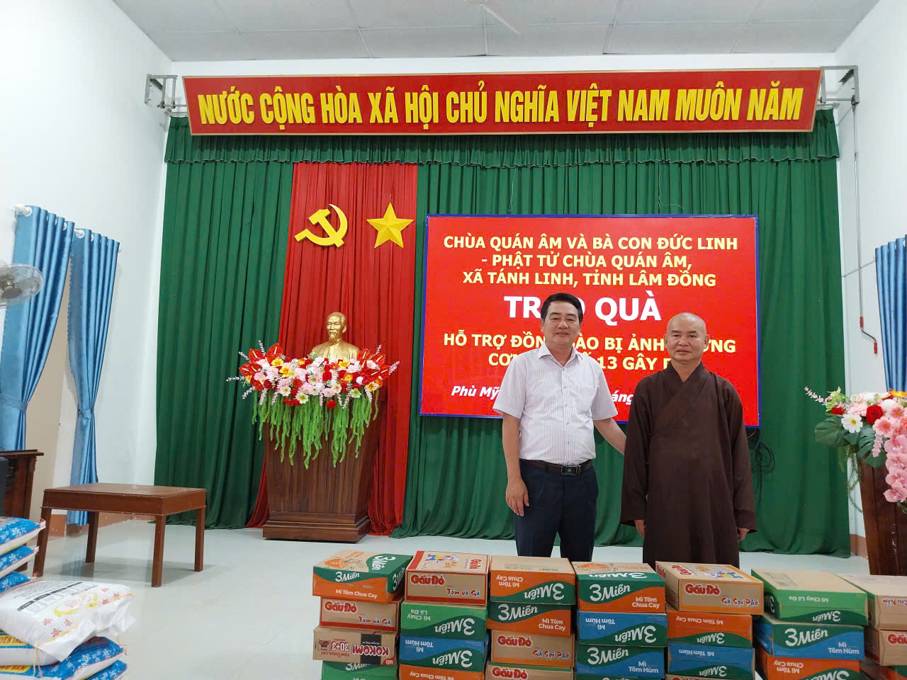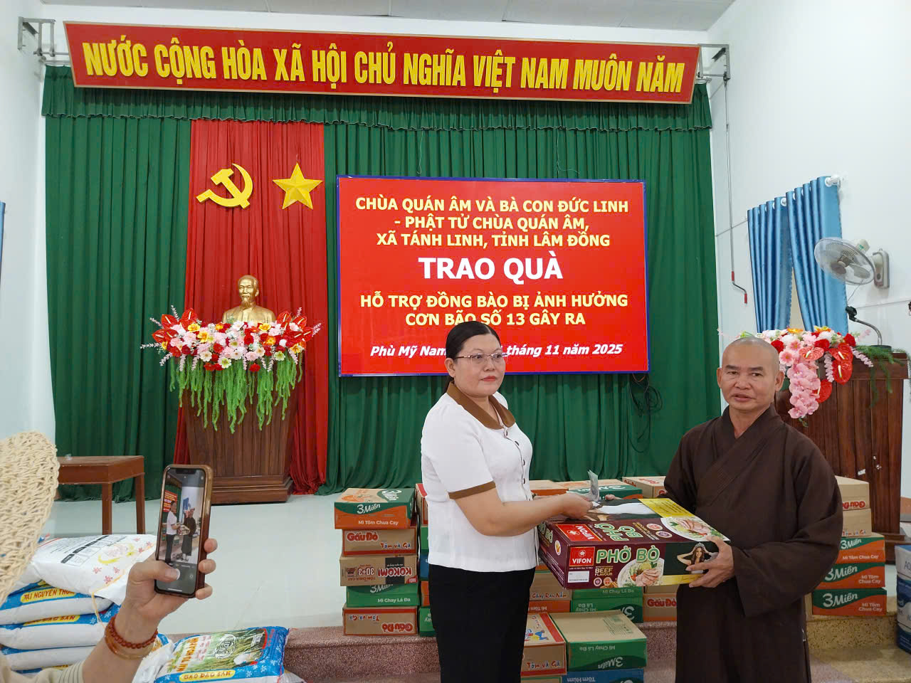 Theo đó, bà con Đức Linh - phật tử chùa Quán Âm, tỉnh Lâm Đồng đã đến thăm và trao tổng cộng 120 phần quà, tổng kinh phí khoảng 36 triệu đồng cho các hộ dân bị ảnh hưởng bởi cơn bão số 13 gây ra. Các phần quà gồm mì tôm, gạo được trao tận tay người dân, nhằm giúp người dân vượt qua khó khăn, sớm ổn định cuộc sống sau bão.