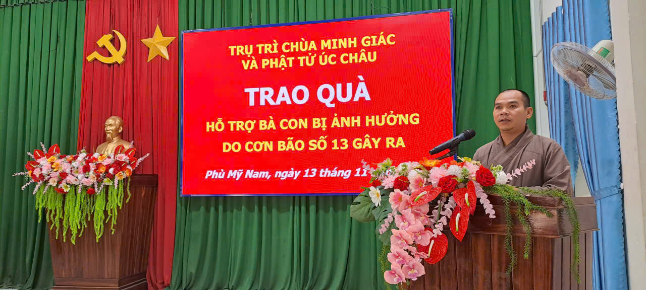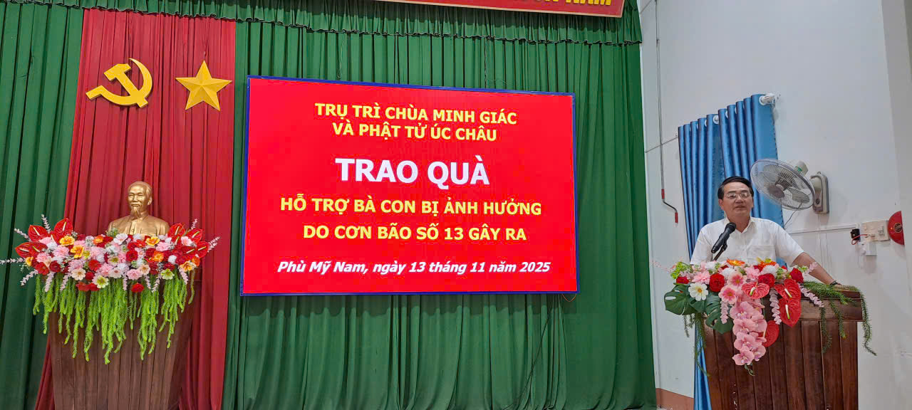 Chiều ngày 13/11/2025, Lãnh đạo UBND xã , UBMTTQVN xã Phù Mỹ Nam cùng các tổ chức chính trị - xã hội của xã đã phối hợp với Trụ trì chùa Minh Giác và phật tử Úc Âu, tổ chức trao quà hỗ trợ cho các hộ dân trên địa bàn xã Phù Mỹ Nam bị thiệt hại do cơn bão số 13 Kamlegi gây ra.